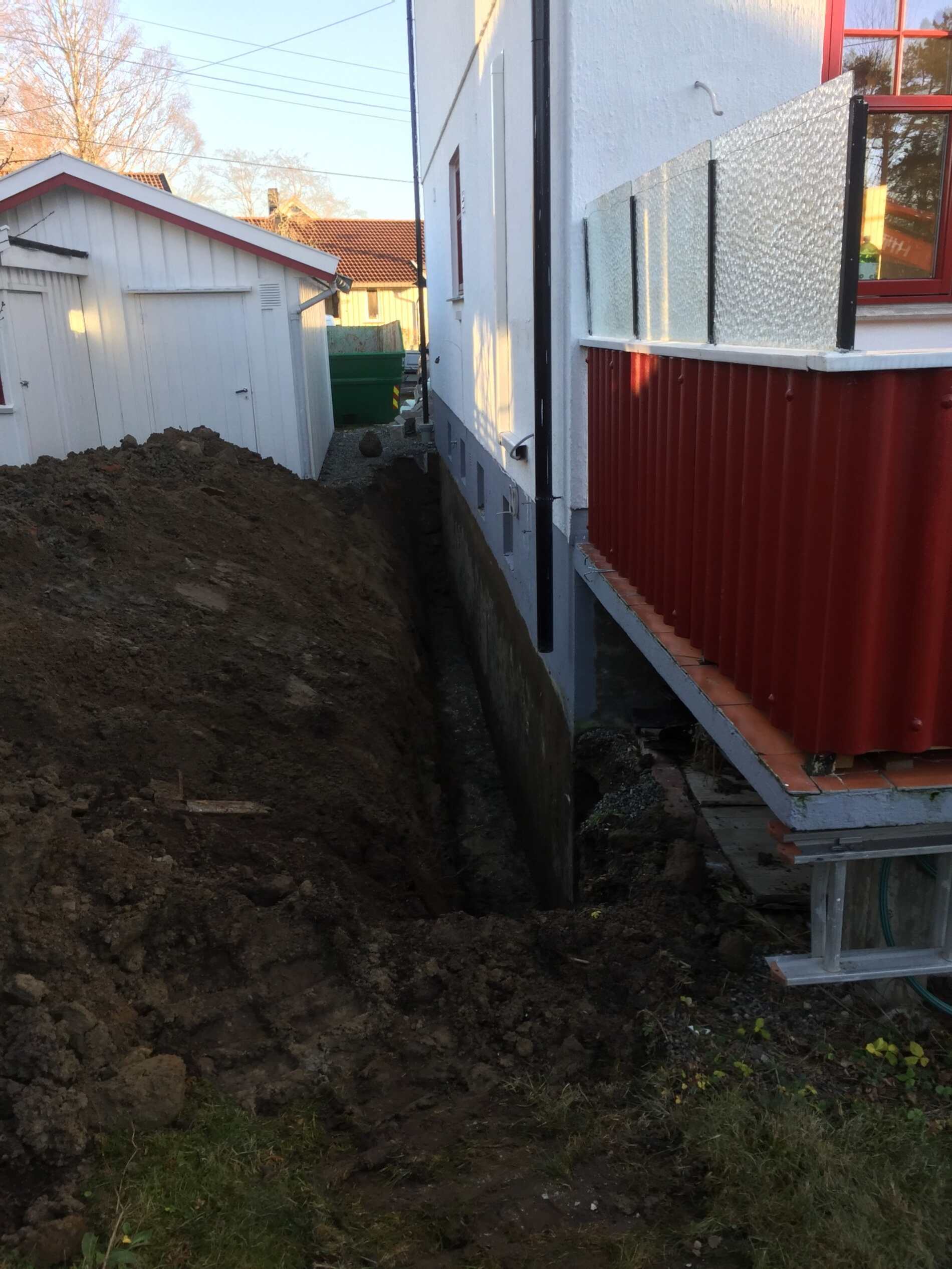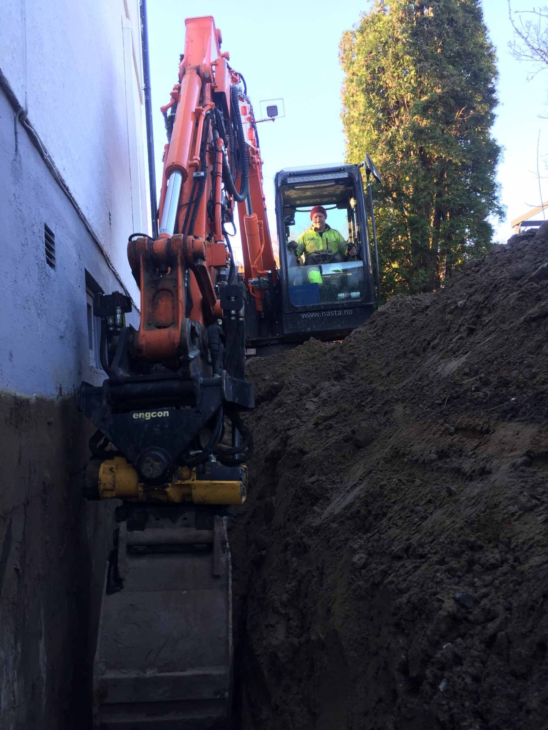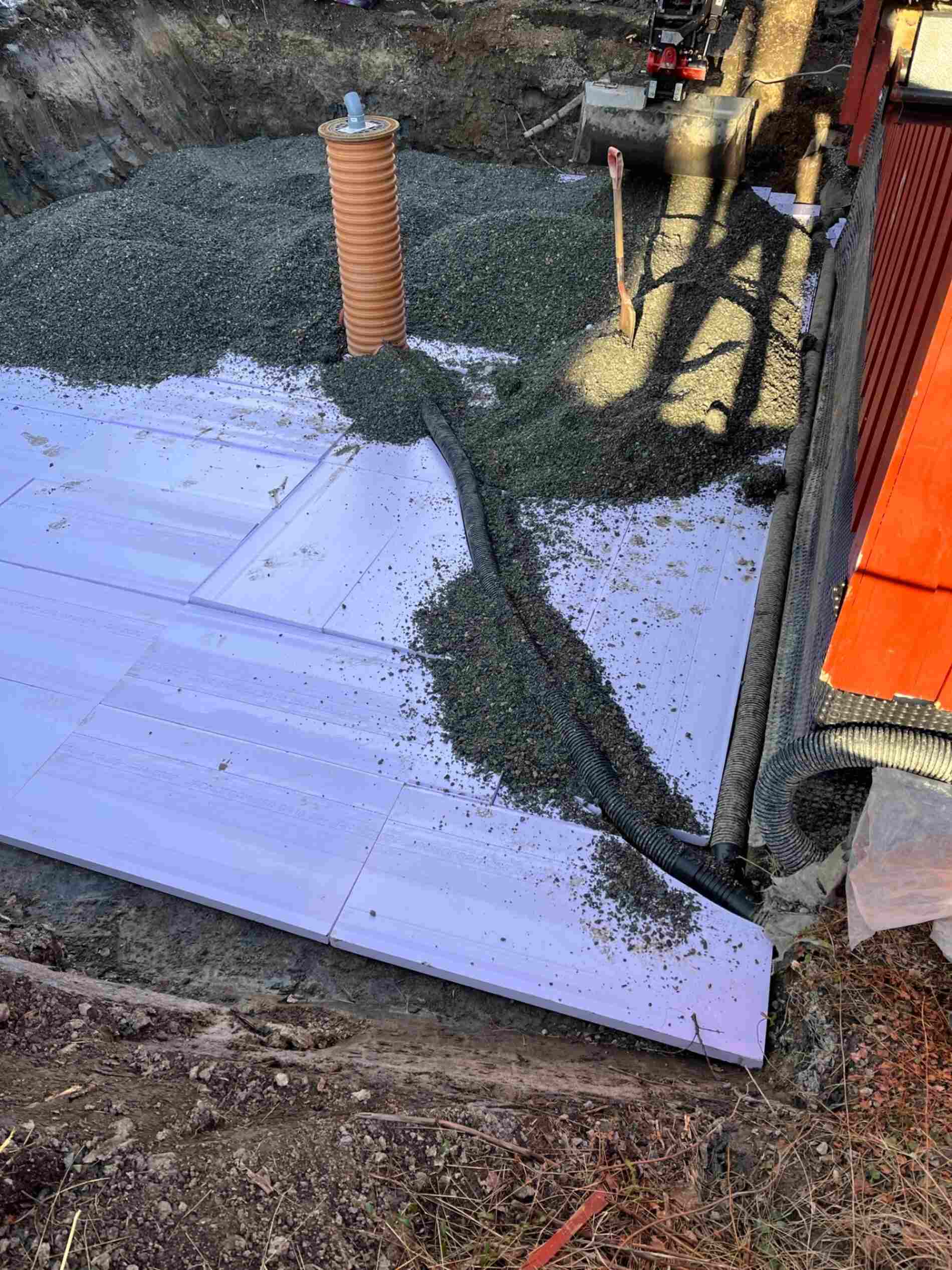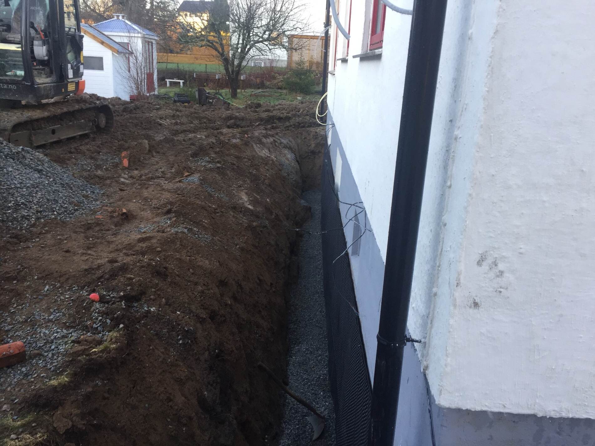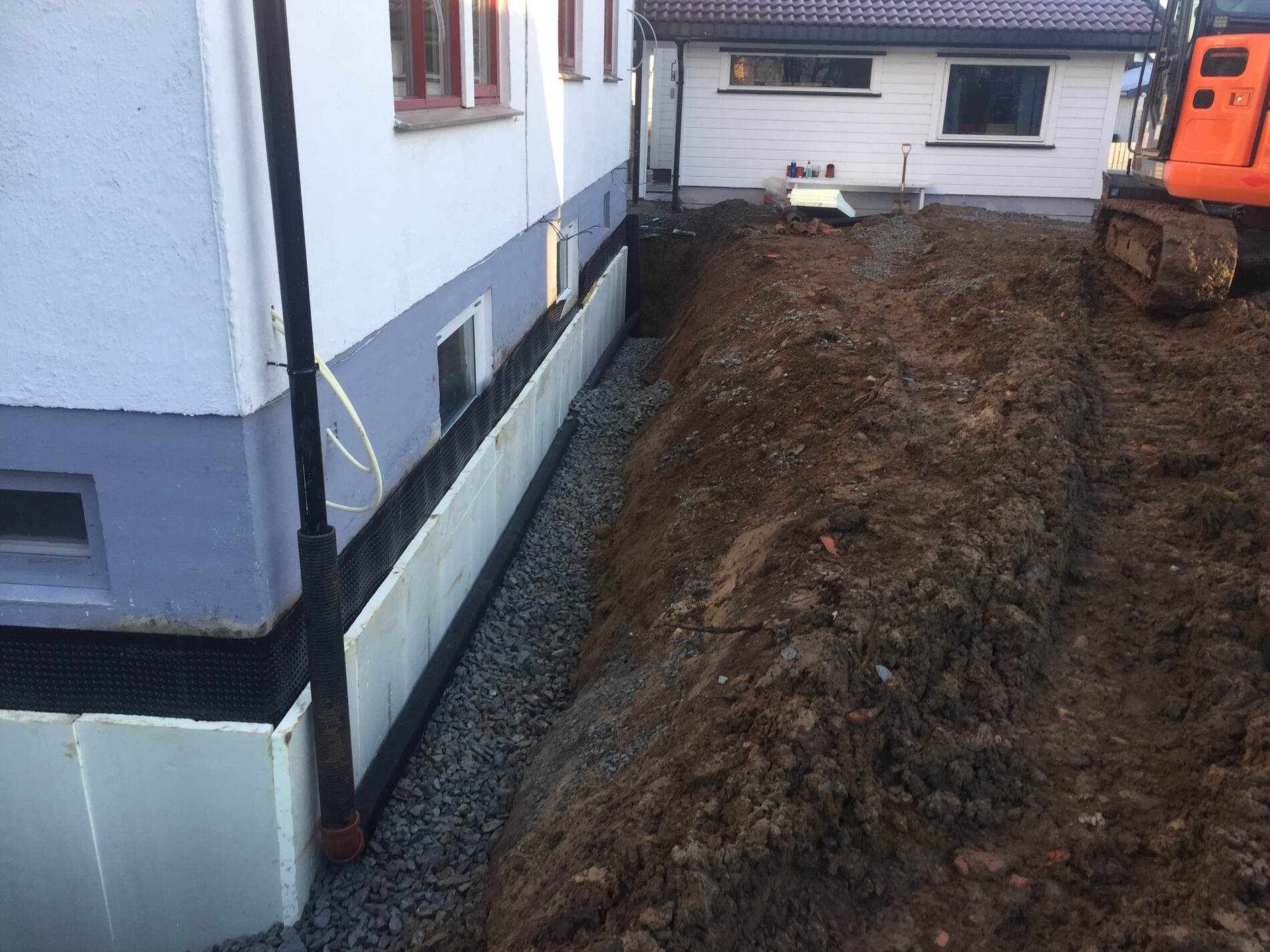 Vi graver grøfter, legger rør, monterer grunnmursplast/isolasjon og tilbakefyller med drenerende masser.