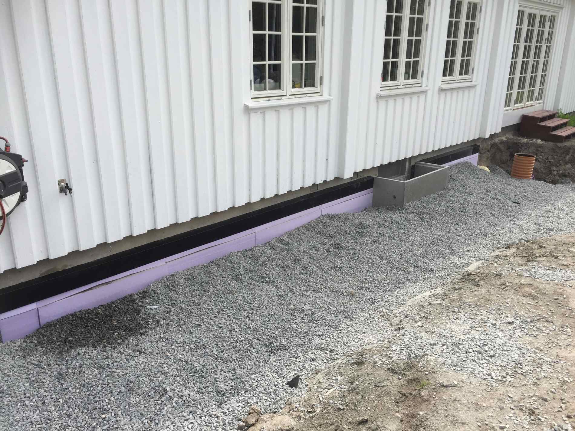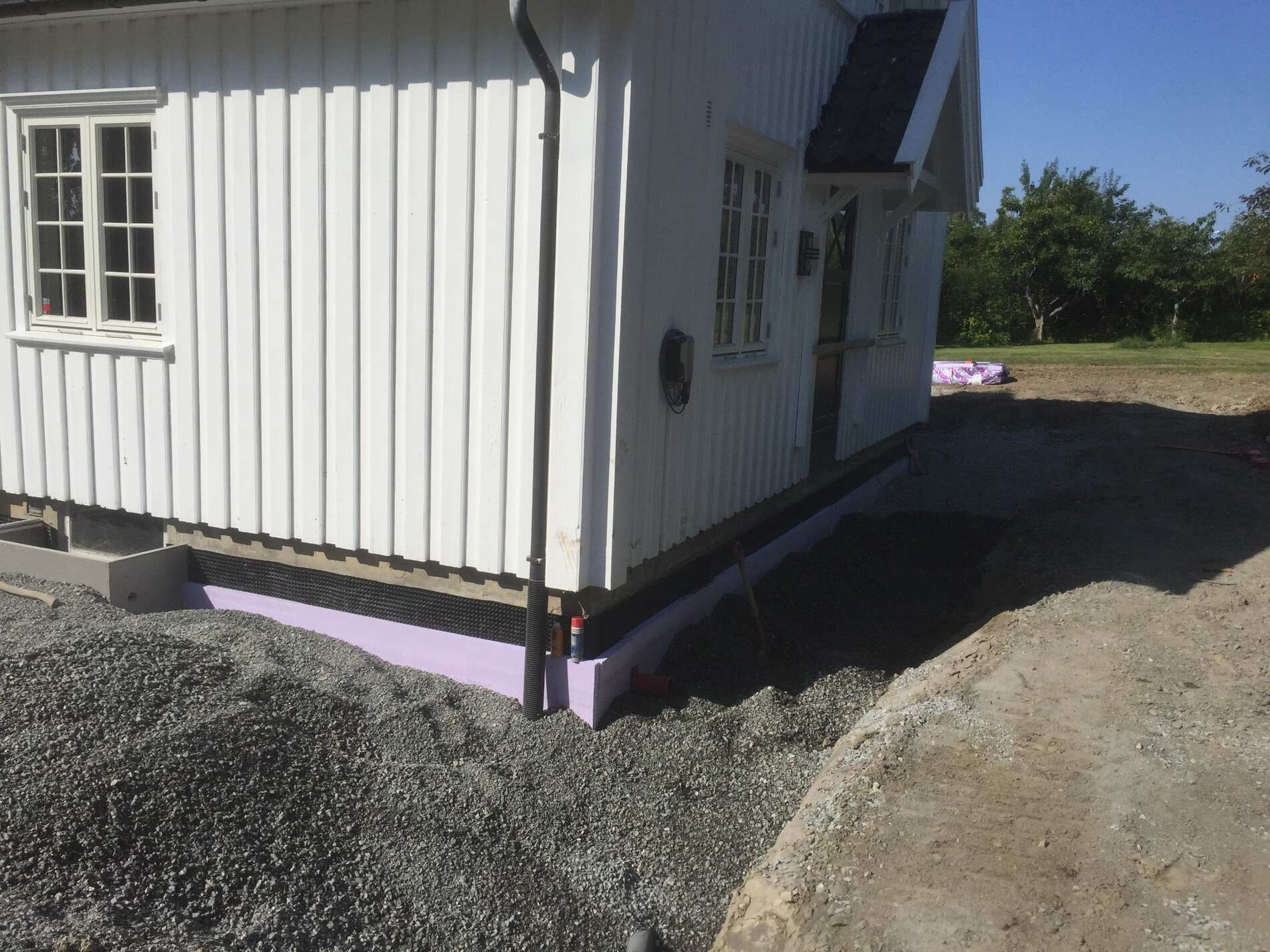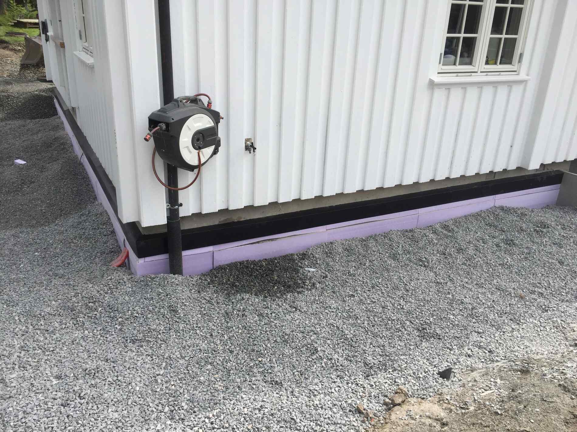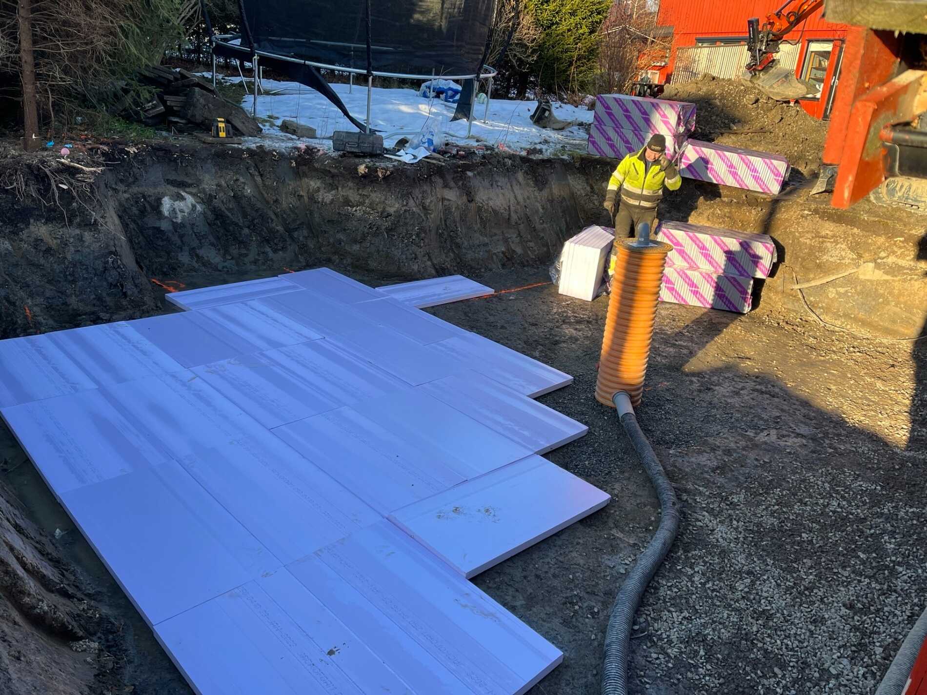 Vi graver grøfter, legger rør, monterer grunnmursplast/isolasjon og tilbakefyller med drenerende masser.