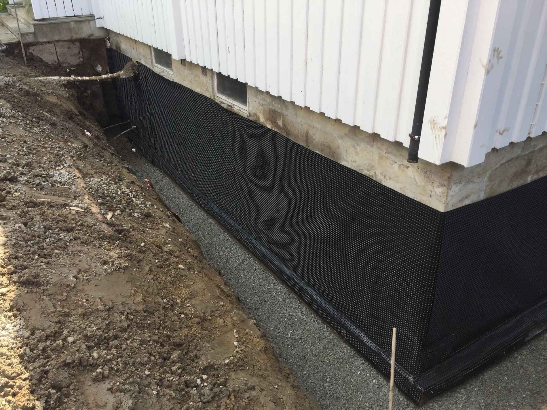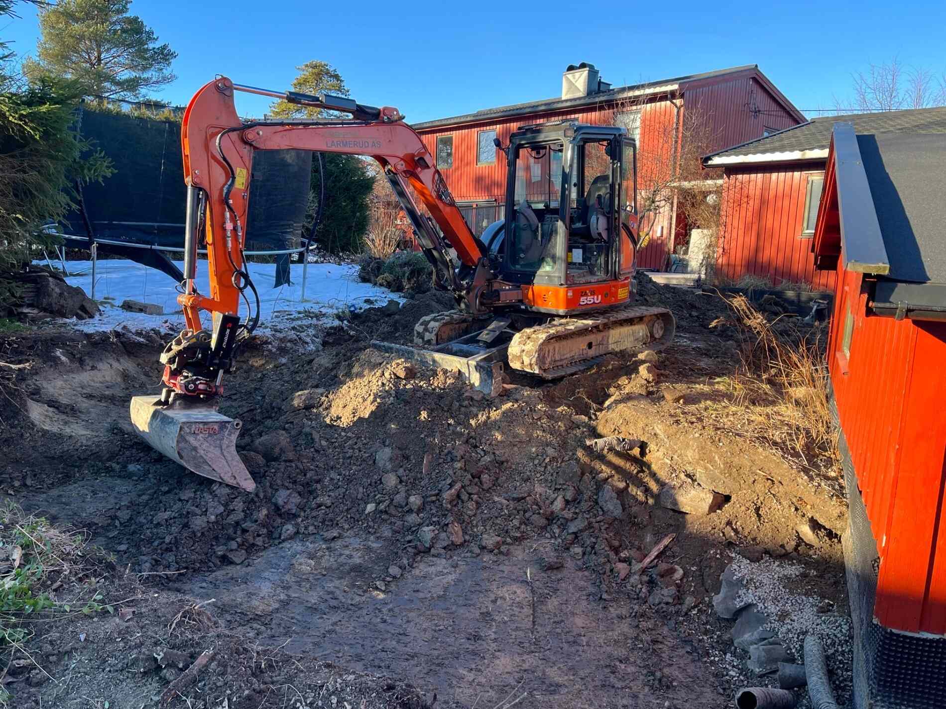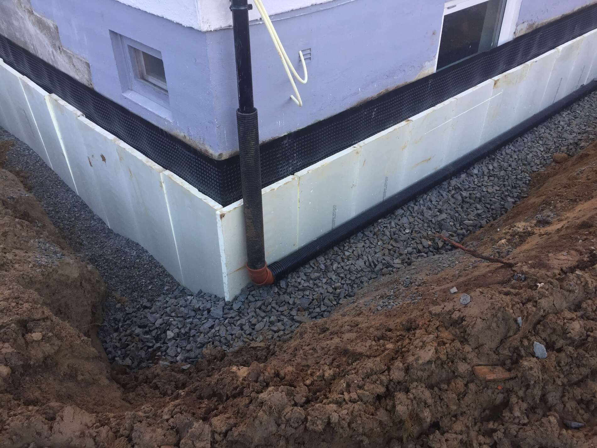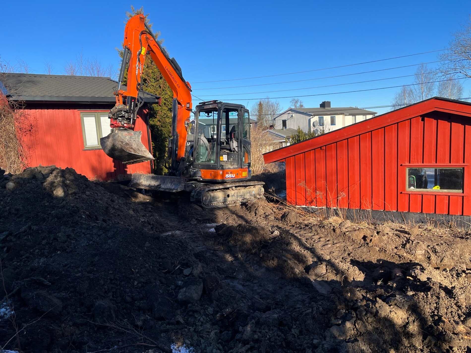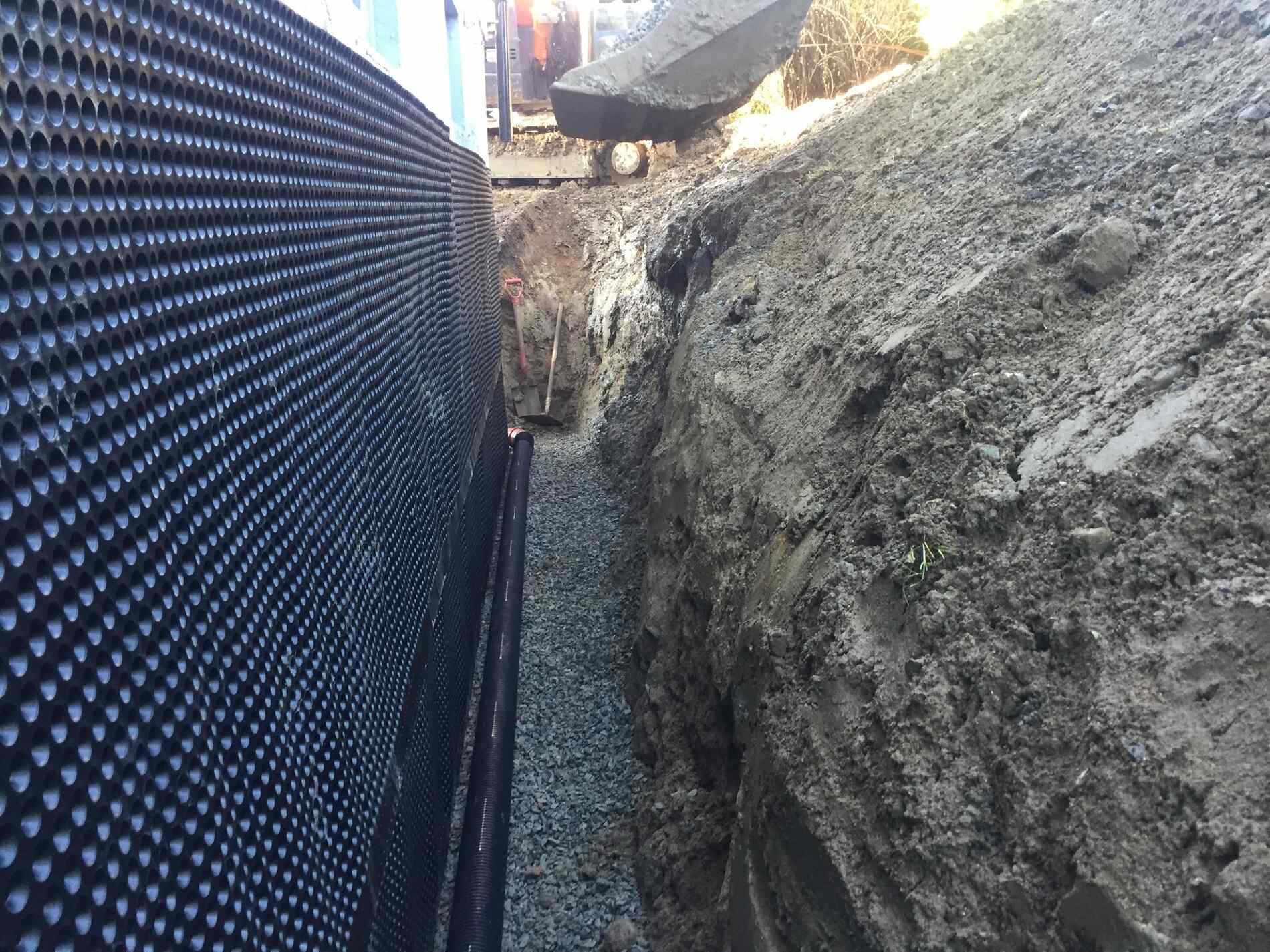 Vi graver grøfter, legger rør, monterer grunnmursplast/isolasjon og tilbakefyller med drenerende masser.