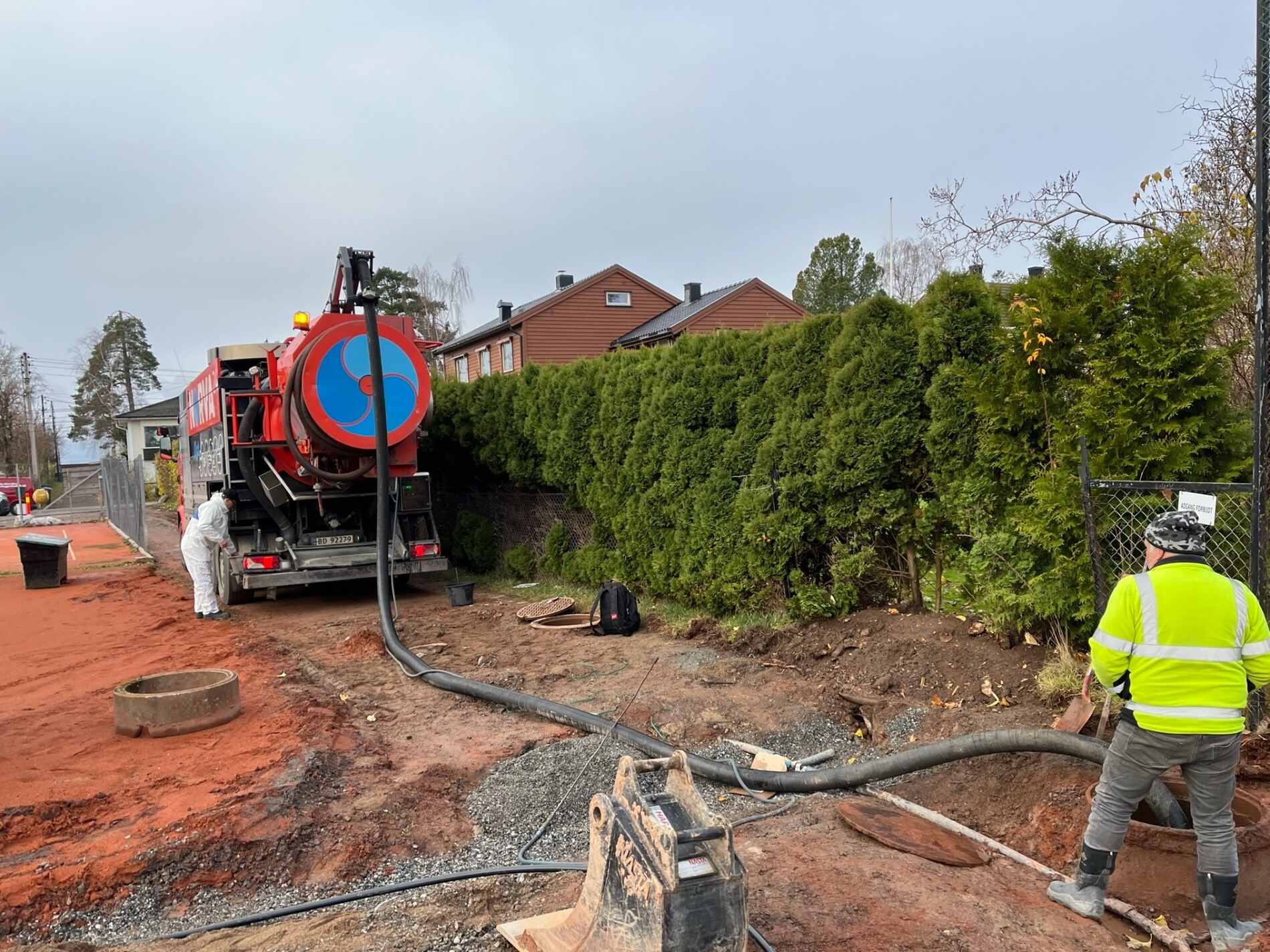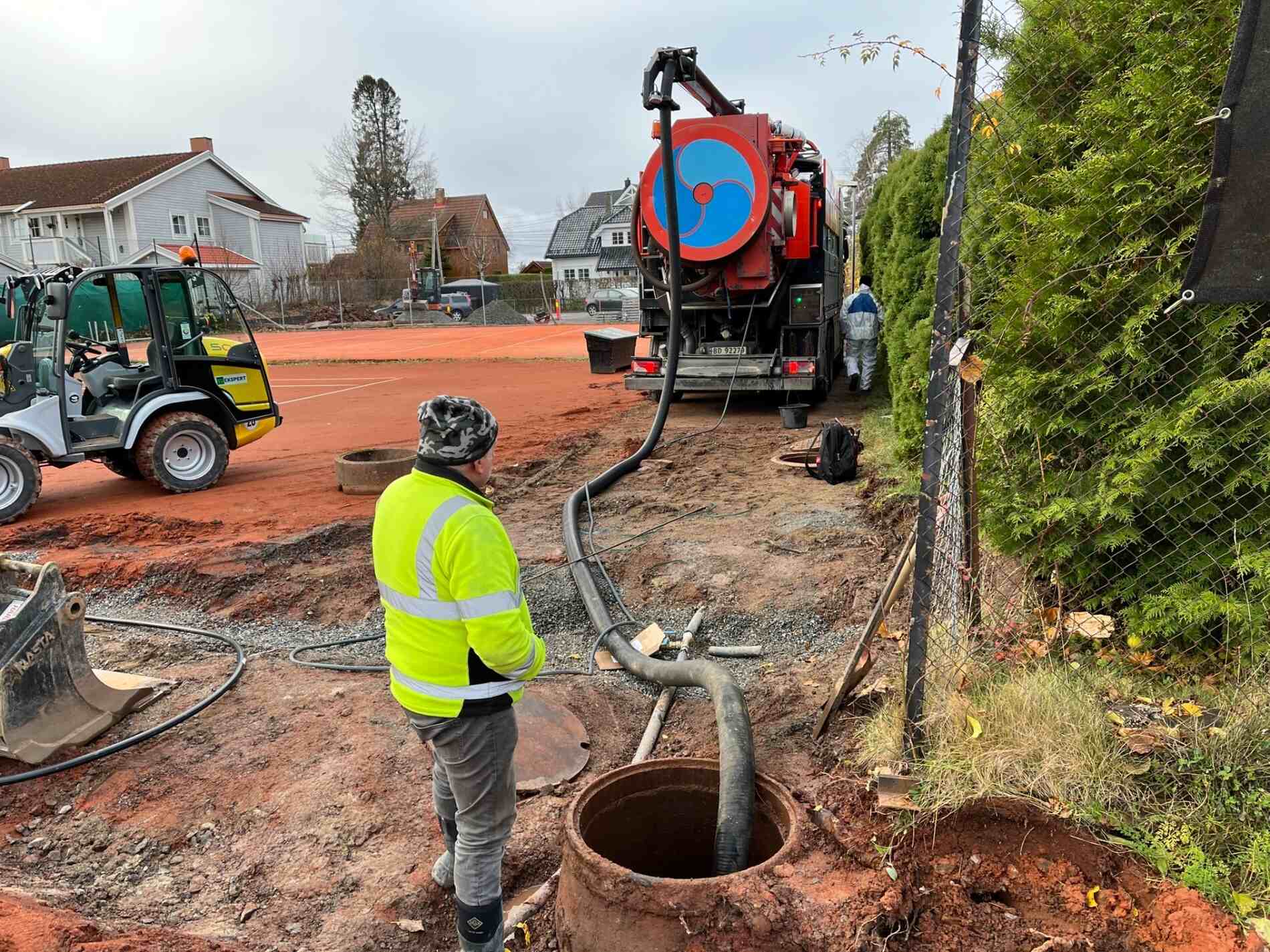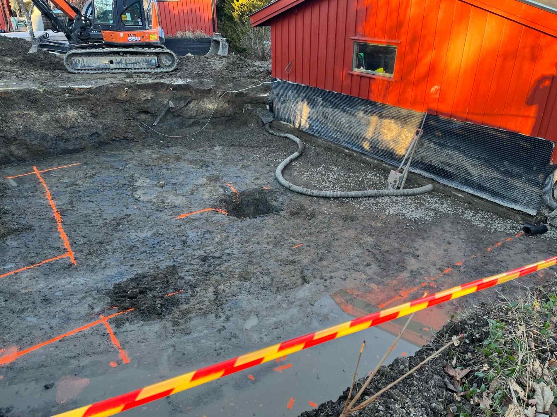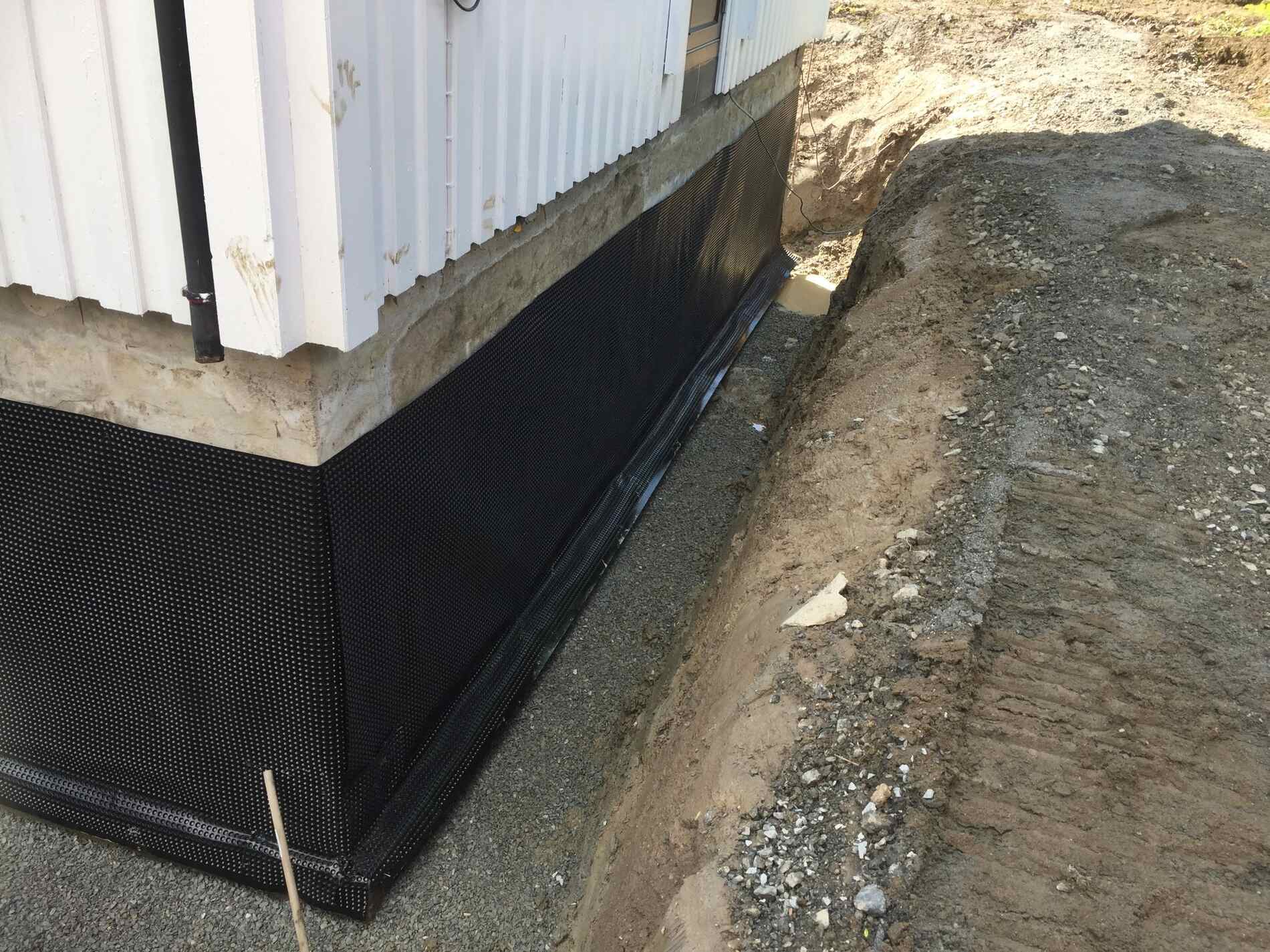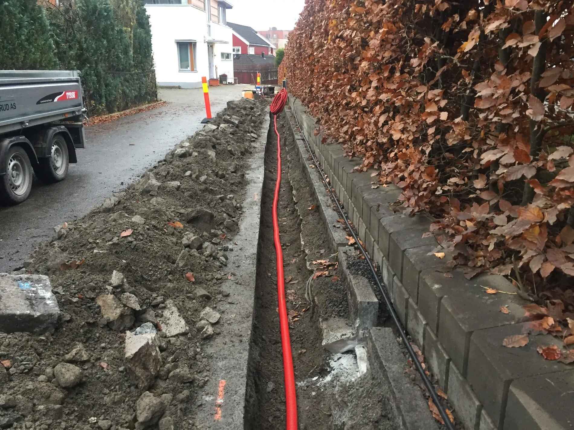 Vi graver grøfter, legger rør, monterer grunnmursplast/isolasjon og tilbakefyller med drenerende masser.